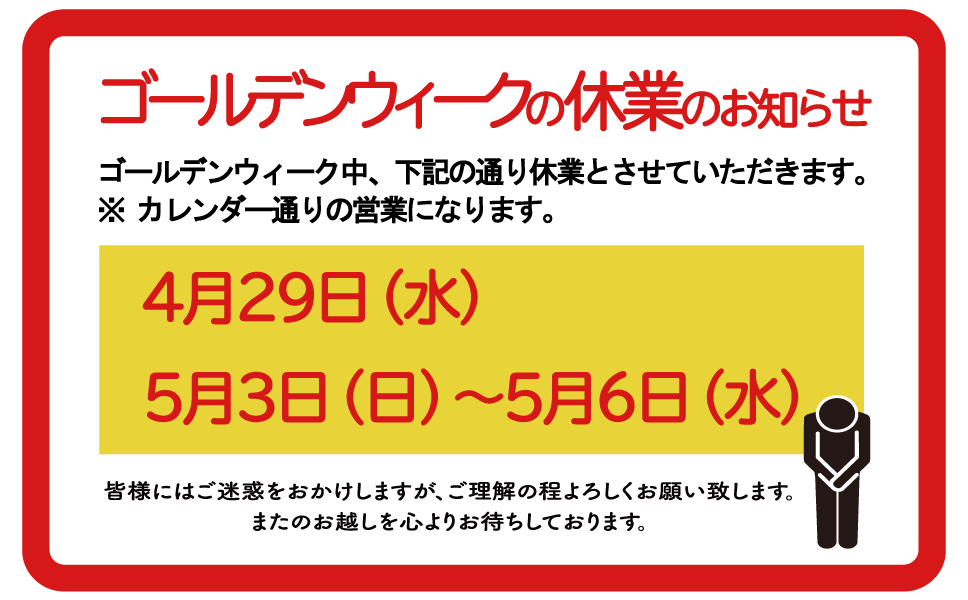 ゴールデンウィーク期間の営業につきまして以下の通りご連絡申し上げます
